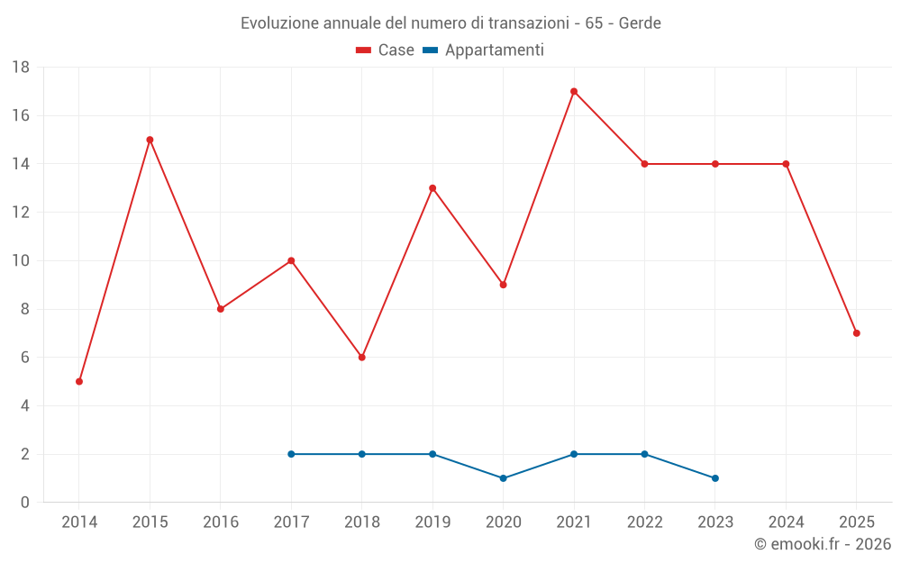 Il prezzo mediano sulle 28 transazioni di case degli ultimi 24 mesi nel comune di Gerde era di 1 896 € al metro quadrato per un valore patrimoniale mediano di 205 762 €. In questo periodo il 60% delle transazioni era tra 1 451 e 2 599 € al metro quadrato (dal 2° all'8° decile).
