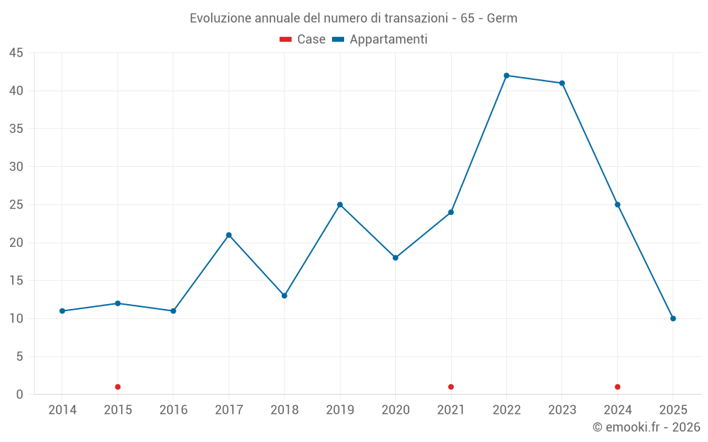 Il prezzo mediano sulle 25 transazioni di appartamenti degli ultimi 12 mesi nel comune di Germ era di 2 926 € al metro quadrato per un valore patrimoniale mediano di 124 550 €. In questo periodo il 60% delle transazioni era tra 1 430 e 3 350 € al metro quadrato (dal 2° all'8° decile).