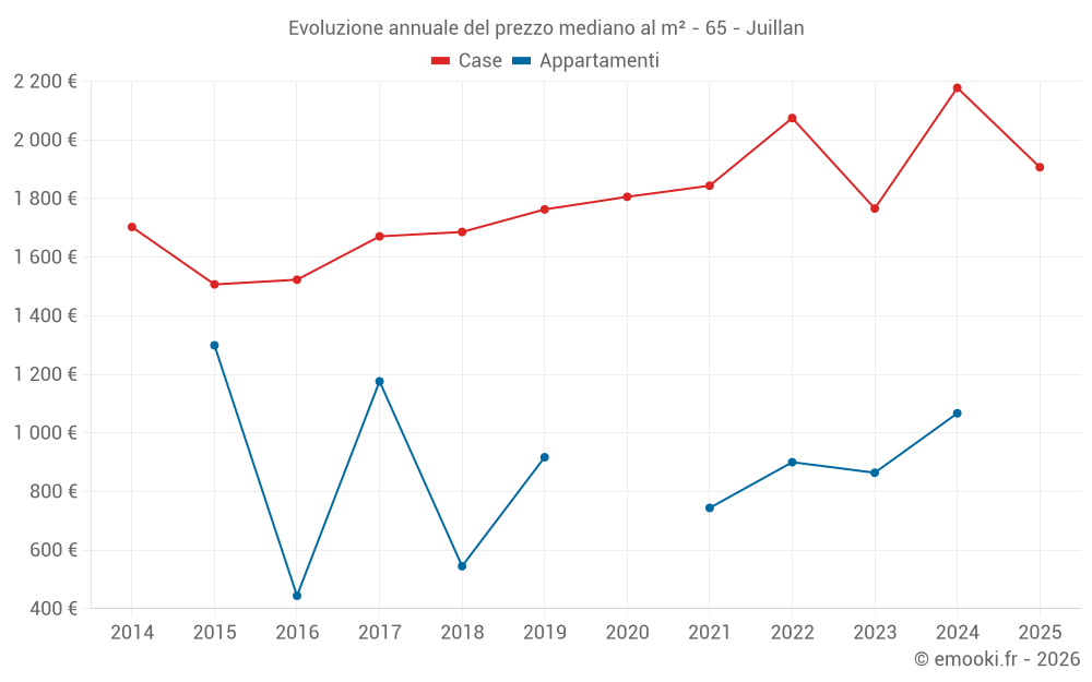 Il prezzo mediano sulle 40 transazioni di case degli ultimi 12 mesi nel comune di Juillan era di 1 994 € al metro quadrato per un valore patrimoniale mediano di 195 500 €. In questo periodo il 60% delle transazioni era tra 1 648 e 2 449 € al metro quadrato (dal 2° all'8° decile).