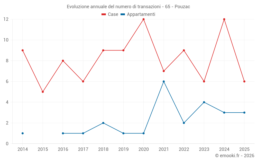 Il prezzo mediano sulle 22 transazioni di case degli ultimi 24 mesi nel comune di Pouzac era di 1 844 € al metro quadrato per un valore patrimoniale mediano di 192 300 €. In questo periodo il 60% delle transazioni era tra 1 180 e 2 461 € al metro quadrato (dal 2° all'8° decile).