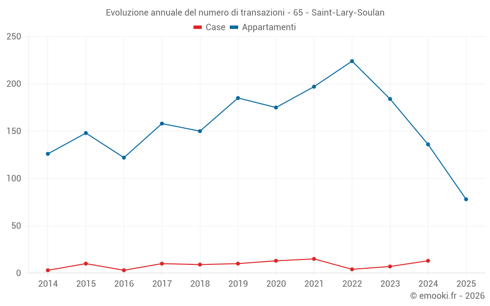 Il prezzo mediano sulle 37 transazioni di appartamenti degli ultimi 3 mesi nel comune di Saint-Lary-Soulan era di 3 043 € al metro quadrato per un valore patrimoniale mediano di 77 900 €. In questo periodo il 60% delle transazioni era tra 2 112 e 4 071 € al metro quadrato (dal 2° all'8° decile).