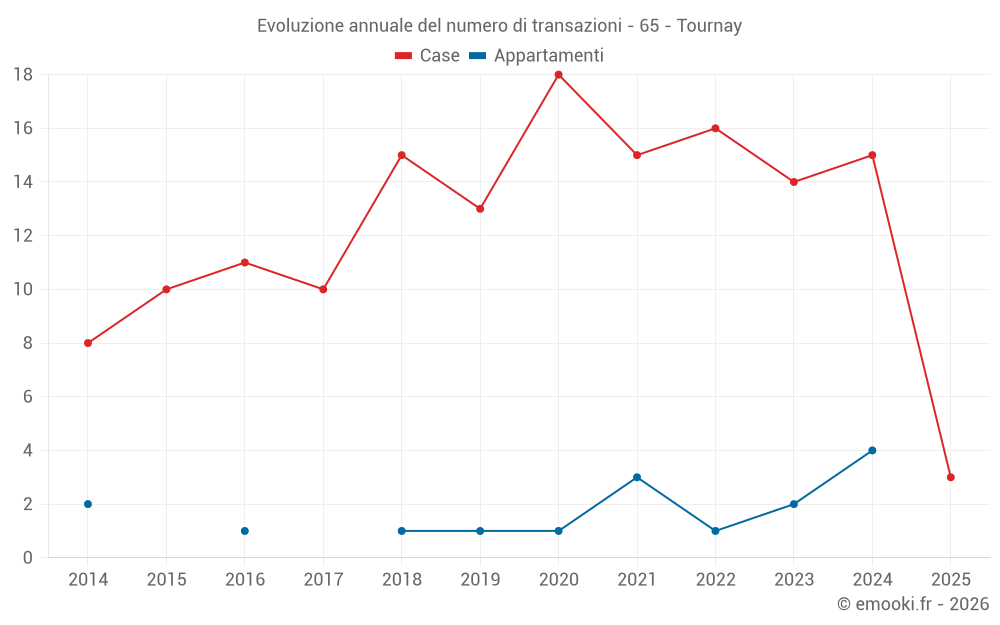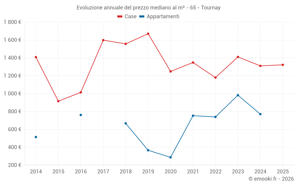 Il prezzo mediano sulle 26 transazioni di case degli ultimi 24 mesi nel comune di Tournay era di 1 445 € al metro quadrato per un valore patrimoniale mediano di 116 425 €. In questo periodo il 60% delle transazioni era tra 967 e 1 894 € al metro quadrato (dal 2° all'8° decile).