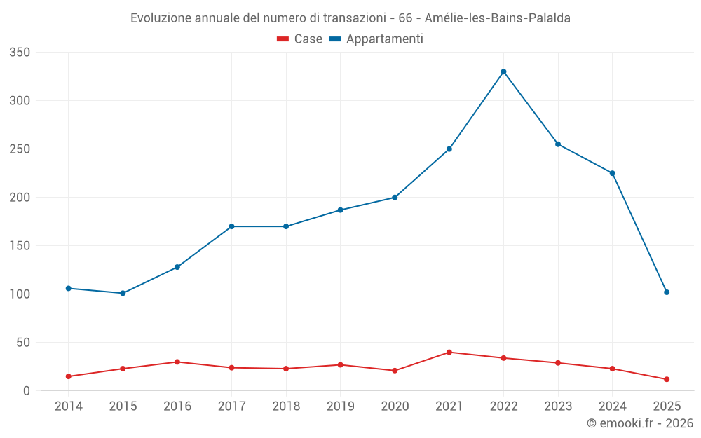 Il prezzo mediano sulle 58 transazioni di appartamenti degli ultimi 3 mesi nel comune di Amélie-les-Bains-Palalda era di 1 444 € al metro quadrato per un valore patrimoniale mediano di 55 475 €. In questo periodo il 60% delle transazioni era tra 1 145 e 1 795 € al metro quadrato (dal 2° all'8° decile).