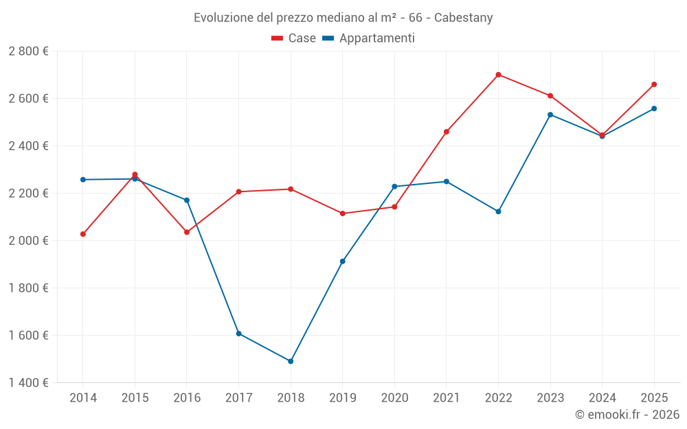 Il prezzo mediano sulle 20 transazioni di appartamenti degli ultimi 12 mesi nel comune di Cabestany era di 2 520 € al metro quadrato per un valore patrimoniale mediano di 173 825 €. In questo periodo il 60% delle transazioni era tra 2 159 e 2 915 € al metro quadrato (dal 2° all'8° decile).