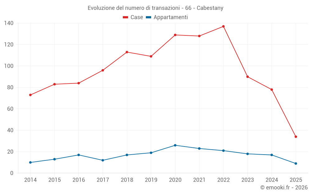 Il prezzo mediano sulle 34 transazioni di case degli ultimi 6 mesi nel comune di Cabestany era di 2 660 € al metro quadrato per un valore patrimoniale mediano di 271 855 €. In questo periodo il 60% delle transazioni era tra 2 077 e 3 218 € al metro quadrato (dal 2° all'8° decile).