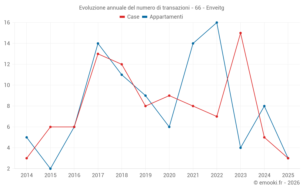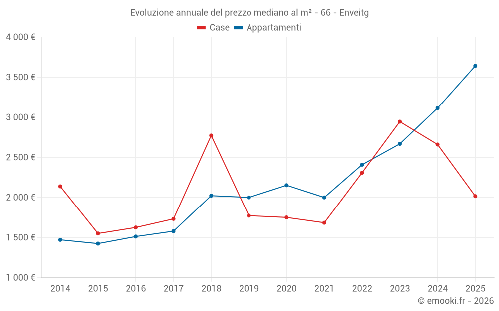 Il prezzo mediano sulle 16 transazioni di case degli ultimi 24 mesi nel comune di Enveitg era di 2 717 € al metro quadrato per un valore patrimoniale mediano di 206 210 €. In questo periodo il 60% delle transazioni era tra 1 819 e 3 200 € al metro quadrato (dal 2° all'8° decile).