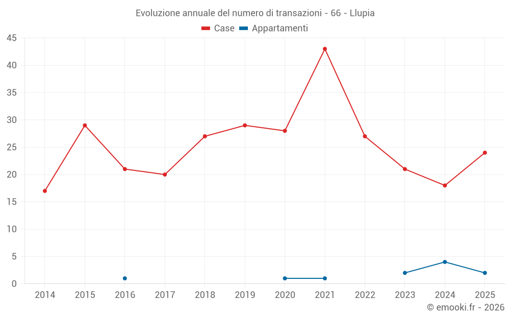 Il prezzo mediano sulle 24 transazioni di case degli ultimi 12 mesi nel comune di Llupia era di 2 572 € al metro quadrato per un valore patrimoniale mediano di 235 736 €. In questo periodo il 60% delle transazioni era tra 1 972 e 3 053 € al metro quadrato (dal 2° all'8° decile).