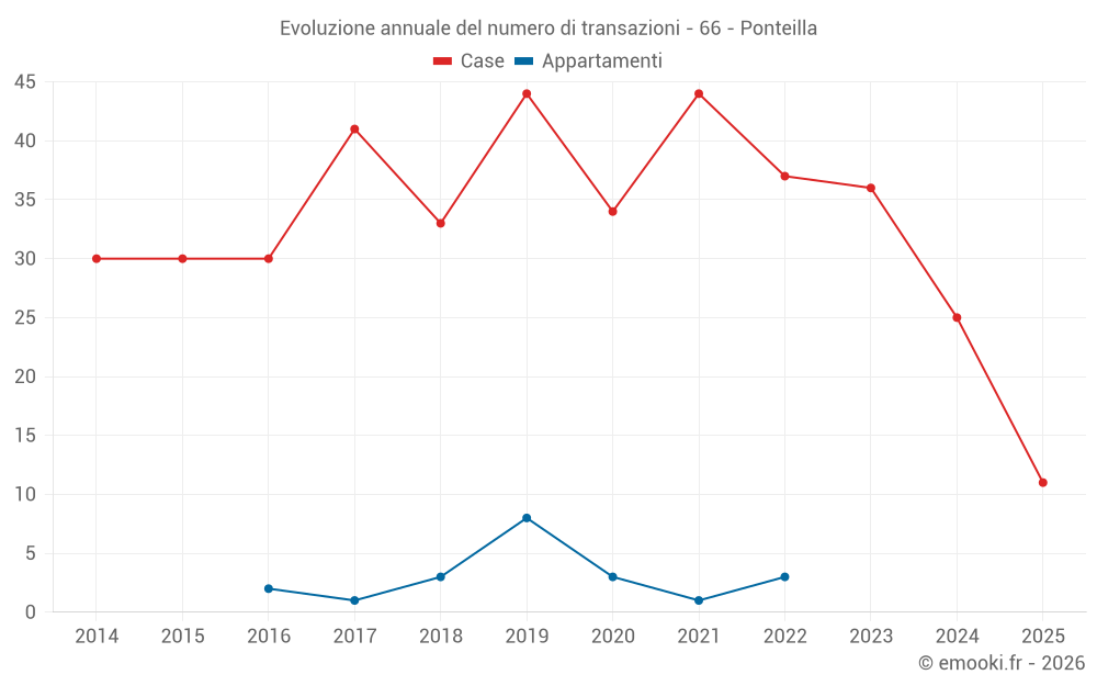 Il prezzo mediano sulle 30 transazioni di case degli ultimi 12 mesi nel comune di Ponteilla era di 2 632 € al metro quadrato per un valore patrimoniale mediano di 249 912 €. In questo periodo il 60% delle transazioni era tra 2 060 e 3 181 € al metro quadrato (dal 2° all'8° decile).
