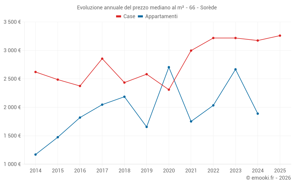 Il prezzo mediano sulle 27 transazioni di case degli ultimi 6 mesi nel comune di Sorède era di 3 260 € al metro quadrato per un valore patrimoniale mediano di 283 000 €. In questo periodo il 60% delle transazioni era tra 2 781 e 3 656 € al metro quadrato (dal 2° all'8° decile).