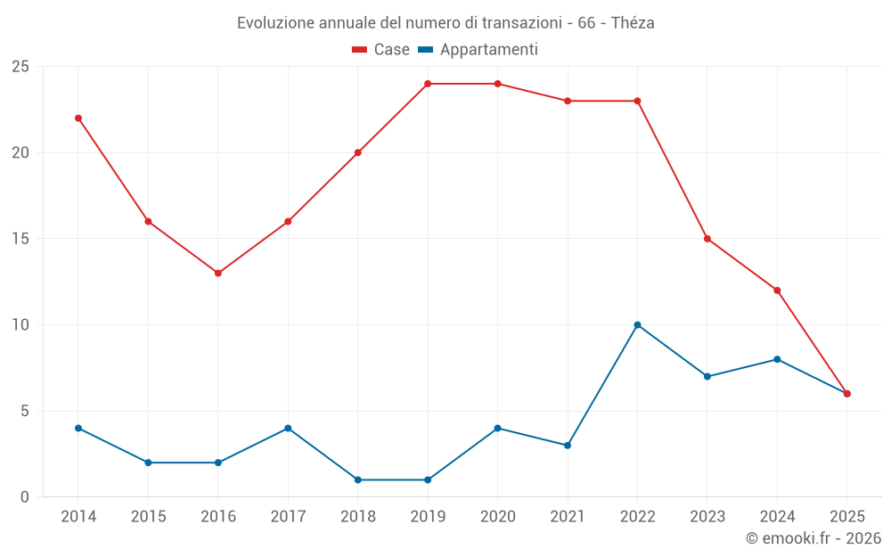 Il prezzo mediano sulle 25 transazioni di case degli ultimi 24 mesi nel comune di Théza era di 2 403 € al metro quadrato per un valore patrimoniale mediano di 225 000 €. In questo periodo il 60% delle transazioni era tra 1 782 e 3 592 € al metro quadrato (dal 2° all'8° decile).