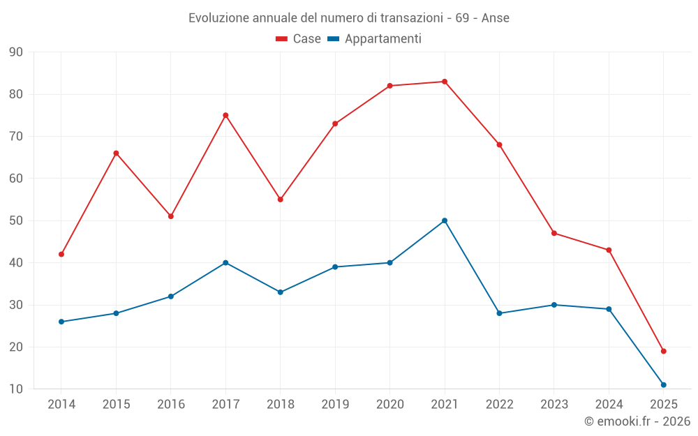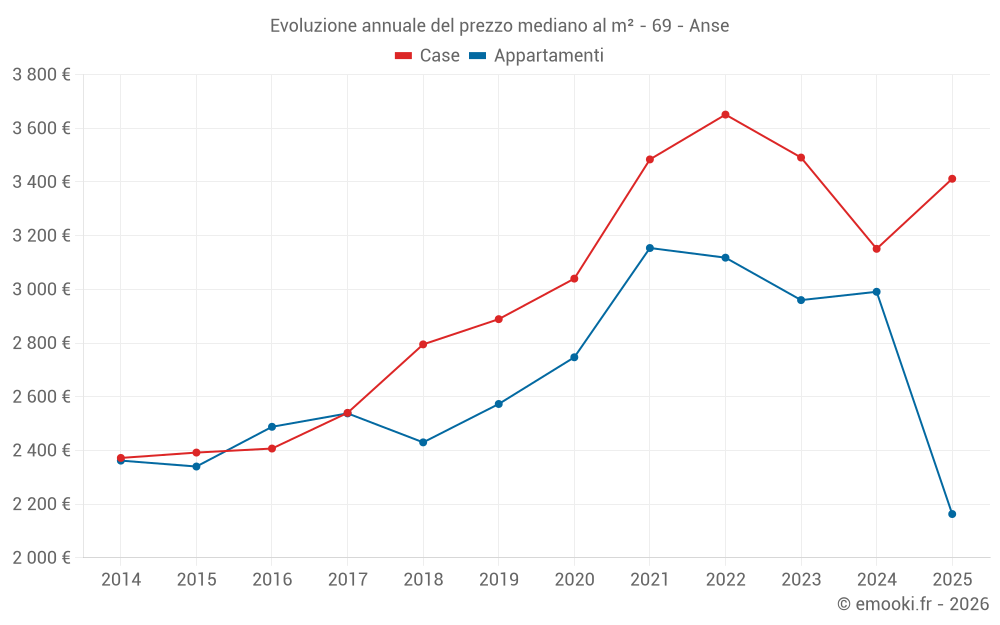 Il prezzo mediano sulle 19 transazioni di case degli ultimi 6 mesi nel comune di Anse era di 3 412 € al metro quadrato per un valore patrimoniale mediano di 340 000 €. In questo periodo il 60% delle transazioni era tra 2 926 e 4 221 € al metro quadrato (dal 2° all'8° decile).