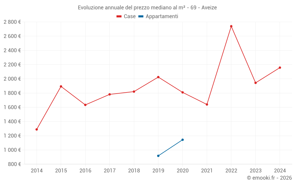 Il prezzo mediano sulle 15 transazioni di case degli ultimi 24 mesi nel comune di Aveize era di 2 103 € al metro quadrato per un valore patrimoniale mediano di 236 950 €. In questo periodo il 60% delle transazioni era tra 1 425 e 2 687 € al metro quadrato (dal 2° all'8° decile).