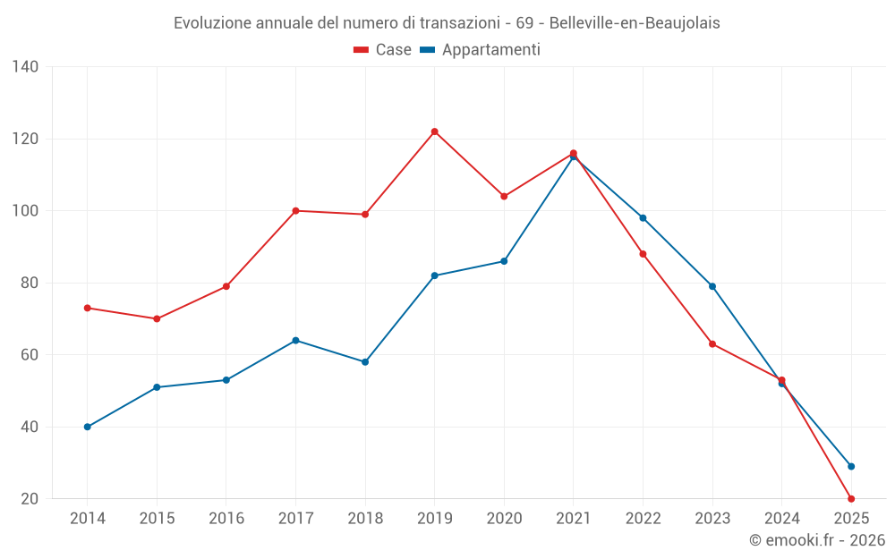 Il prezzo mediano sulle 20 transazioni di case degli ultimi 6 mesi nel comune di Belleville-en-Beaujolais era di 2 734 € al metro quadrato per un valore patrimoniale mediano di 241 250 €. In questo periodo il 60% delle transazioni era tra 2 345 e 3 111 € al metro quadrato (dal 2° all'8° decile).