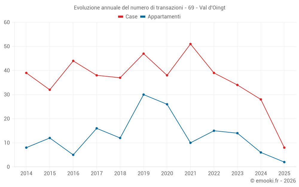 Il prezzo mediano sulle 22 transazioni di case degli ultimi 12 mesi nel comune di Val d'Oingt era di 3 654 € al metro quadrato per un valore patrimoniale mediano di 426 677 €. In questo periodo il 60% delle transazioni era tra 3 001 e 4 200 € al metro quadrato (dal 2° all'8° decile).
