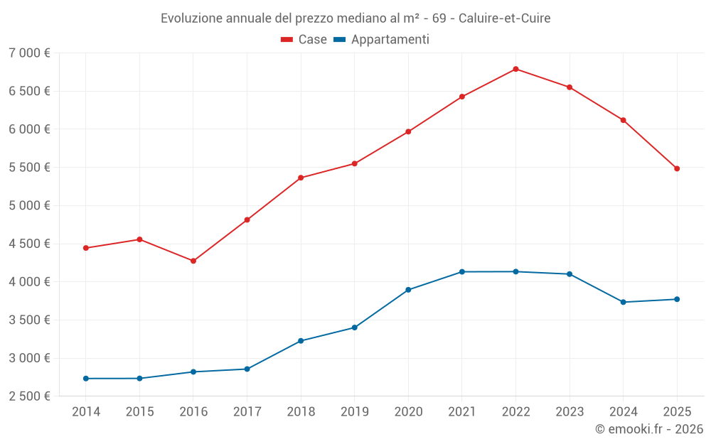 Il prezzo mediano sulle 33 transazioni di case degli ultimi 6 mesi nel comune di Caluire-et-Cuire era di 5 484 € al metro quadrato per un valore patrimoniale mediano di 650 000 €. In questo periodo il 60% delle transazioni era tra 4 566 e 7 695 € al metro quadrato (dal 2° all'8° decile).