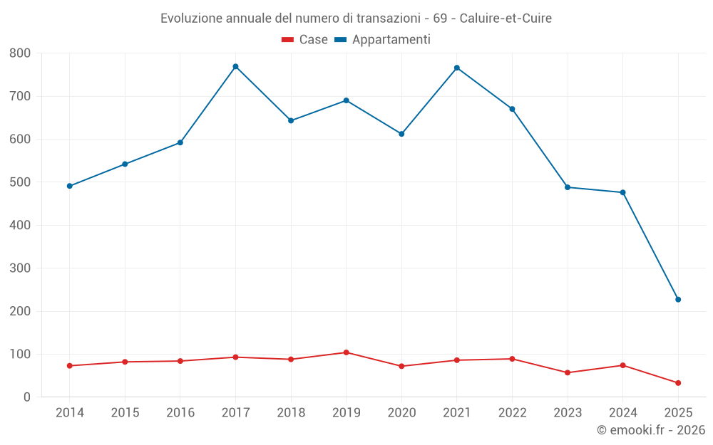 Il prezzo mediano sulle 83 transazioni di appartamenti degli ultimi 3 mesi nel comune di Caluire-et-Cuire era di 3 860 € al metro quadrato per un valore patrimoniale mediano di 231 240 €. In questo periodo il 60% delle transazioni era tra 2 913 e 4 920 € al metro quadrato (dal 2° all'8° decile).