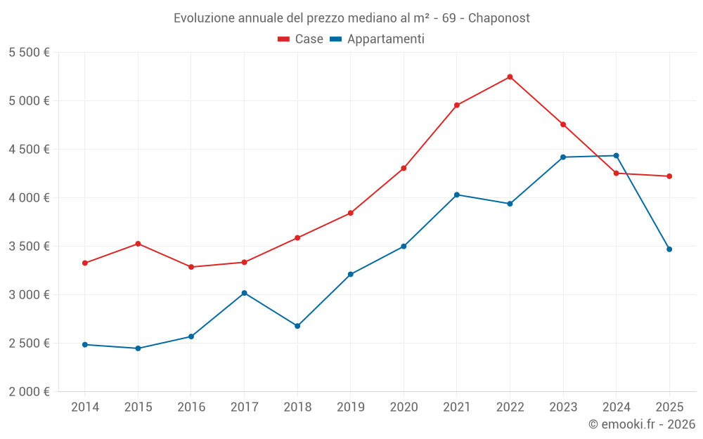 Il prezzo mediano sulle 19 transazioni di case degli ultimi 6 mesi nel comune di Chaponost era di 4 223 € al metro quadrato per un valore patrimoniale mediano di 439 470 €. In questo periodo il 60% delle transazioni era tra 3 514 e 4 971 € al metro quadrato (dal 2° all'8° decile).