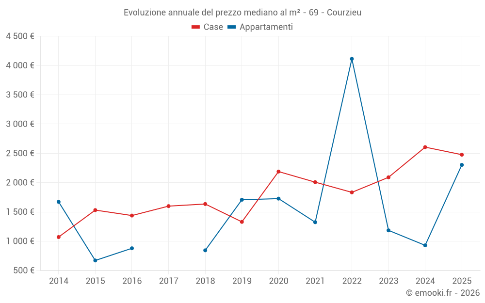 Il prezzo mediano sulle 25 transazioni di case degli ultimi 24 mesi nel comune di Courzieu era di 2 605 € al metro quadrato per un valore patrimoniale mediano di 210 000 €. In questo periodo il 60% delle transazioni era tra 1 498 e 3 141 € al metro quadrato (dal 2° all'8° decile).