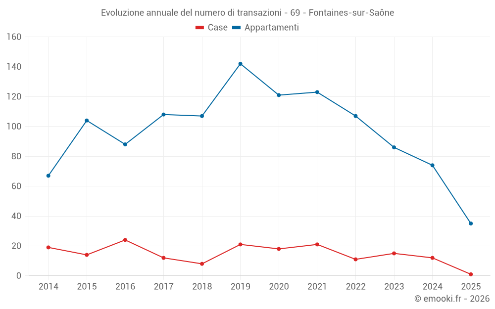 Il prezzo mediano sulle 35 transazioni di appartamenti degli ultimi 6 mesi nel comune di Fontaines-sur-Saône era di 2 885 € al metro quadrato per un valore patrimoniale mediano di 212 000 €. In questo periodo il 60% delle transazioni era tra 2 422 e 4 028 € al metro quadrato (dal 2° all'8° decile).