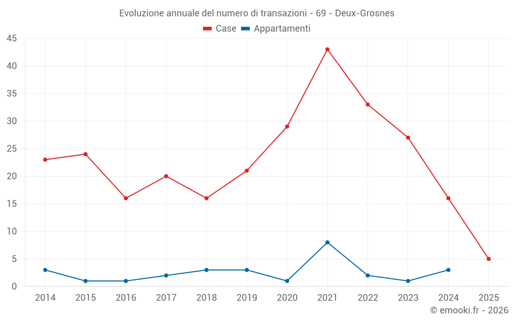 Il prezzo mediano sulle 36 transazioni di case degli ultimi 24 mesi nel comune di Deux-Grosnes era di 1 656 € al metro quadrato per un valore patrimoniale mediano di 142 750 €. In questo periodo il 60% delle transazioni era tra 956 e 2 211 € al metro quadrato (dal 2° all'8° decile).