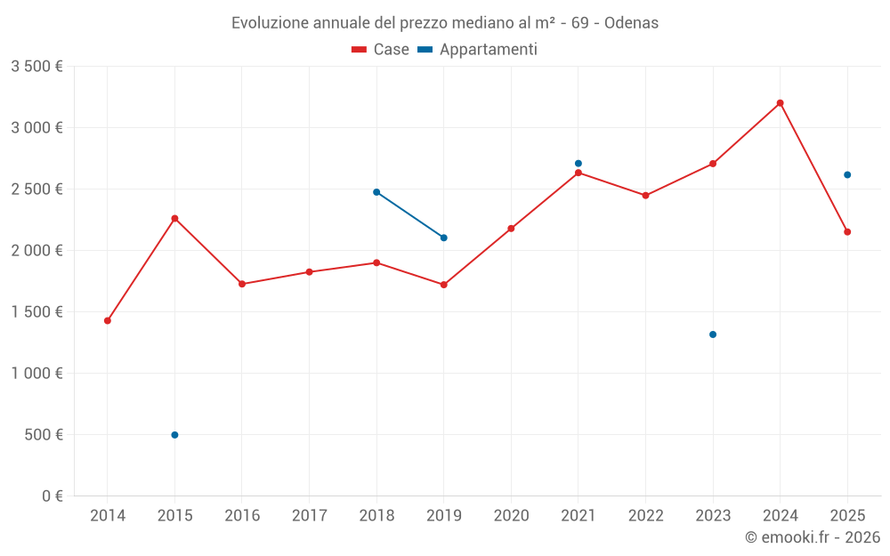 Il prezzo mediano sulle 15 transazioni di case degli ultimi 24 mesi nel comune di Odenas era di 2 611 € al metro quadrato per un valore patrimoniale mediano di 345 150 €. In questo periodo il 60% delle transazioni era tra 1 829 e 3 451 € al metro quadrato (dal 2° all'8° decile).
