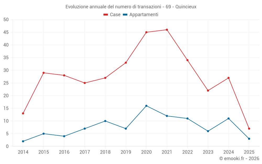 Il prezzo mediano sulle 16 transazioni di appartamenti degli ultimi 24 mesi nel comune di Quincieux era di 3 292 € al metro quadrato per un valore patrimoniale mediano di 281 445 €. In questo periodo il 60% delle transazioni era tra 2 698 e 3 560 € al metro quadrato (dal 2° all'8° decile).