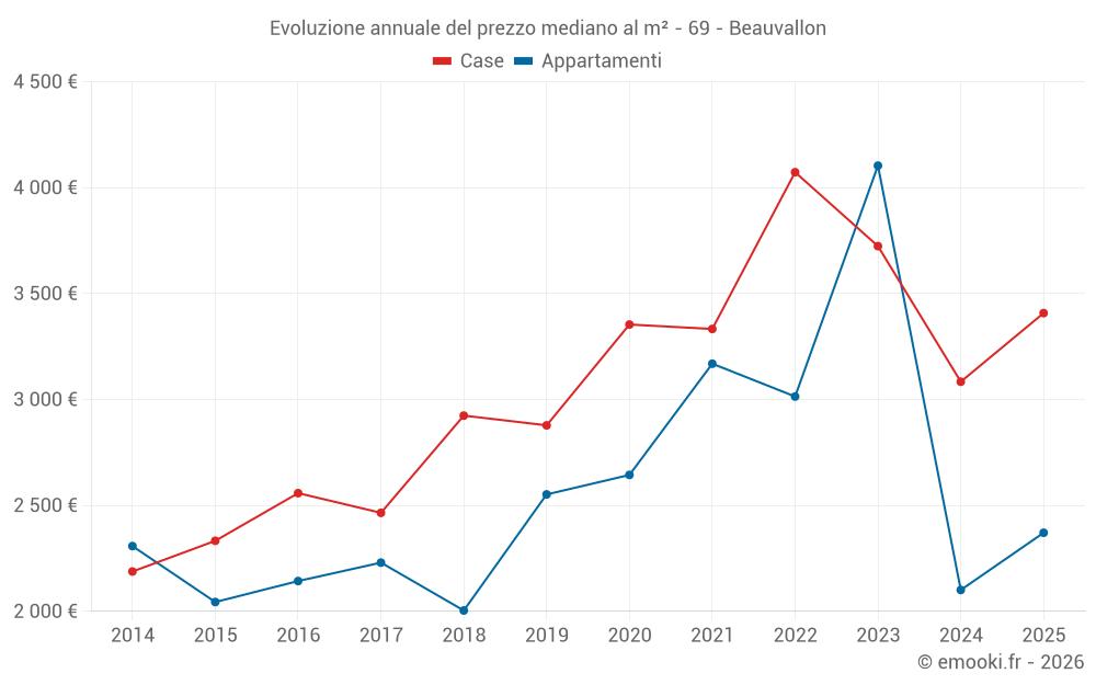 Il prezzo mediano sulle 16 transazioni di case degli ultimi 12 mesi nel comune di Beauvallon era di 3 626 € al metro quadrato per un valore patrimoniale mediano di 377 375 €. In questo periodo il 60% delle transazioni era tra 2 401 e 4 095 € al metro quadrato (dal 2° all'8° decile).