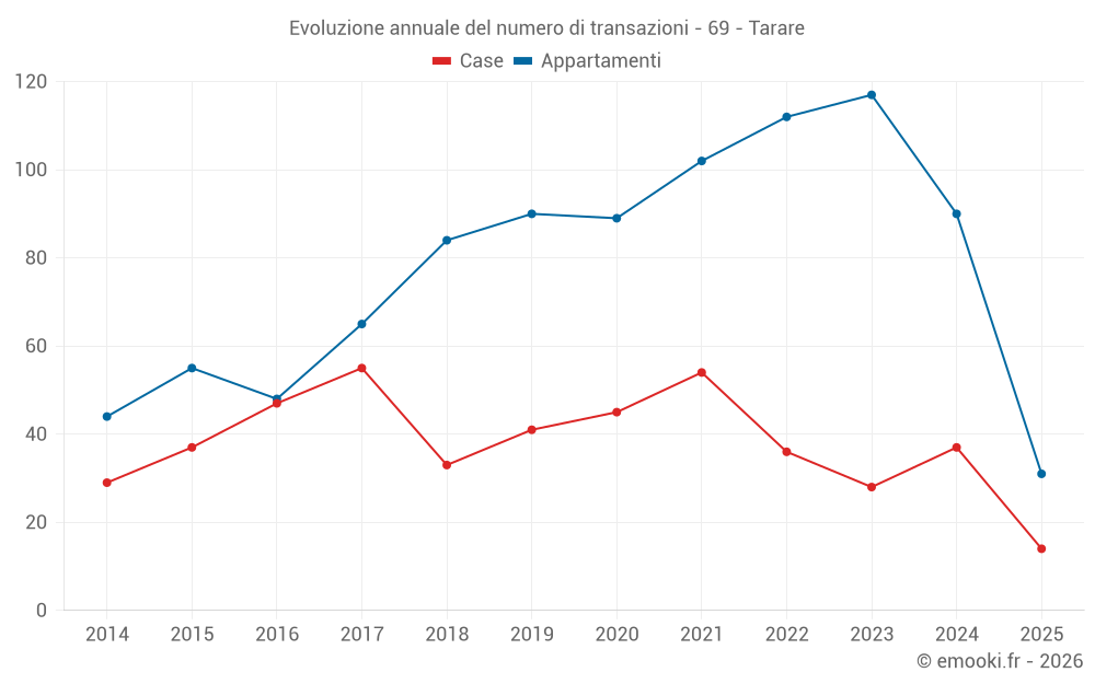 Il prezzo mediano sulle 31 transazioni di appartamenti degli ultimi 6 mesi nel comune di Tarare era di 1 607 € al metro quadrato per un valore patrimoniale mediano di 110 000 €. In questo periodo il 60% delle transazioni era tra 1 094 e 2 221 € al metro quadrato (dal 2° all'8° decile).