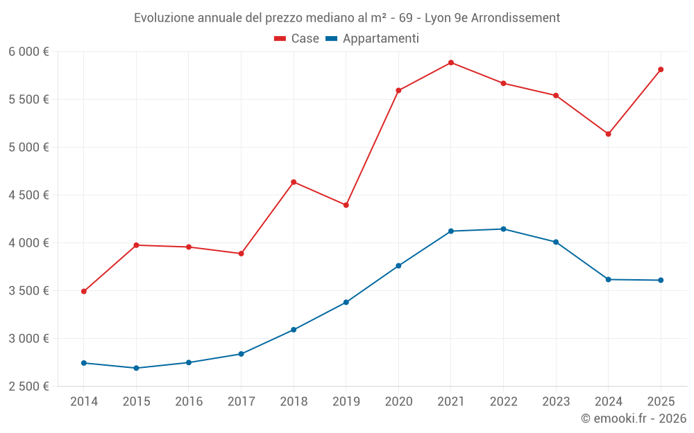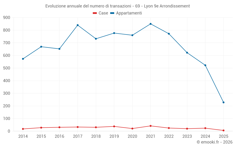 Il prezzo mediano sulle 90 transazioni di appartamenti degli ultimi 3 mesi nel comune di Lyon 9e Arrondissement era di 3 644 € al metro quadrato per un valore patrimoniale mediano di 193 000 €. In questo periodo il 60% delle transazioni era tra 2 531 e 4 645 € al metro quadrato (dal 2° all'8° decile).