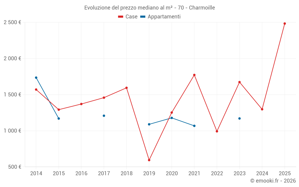 Il prezzo mediano sulle 14 transazioni di case degli ultimi 24 mesi nel comune di Charmoille era di 1 350 € al metro quadrato per un valore patrimoniale mediano di 152 228 €. In questo periodo il 60% delle transazioni era tra 1 150 e 1 986 € al metro quadrato (dal 2° all'8° decile).