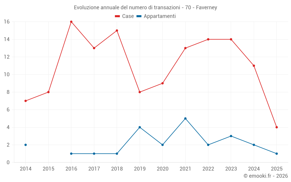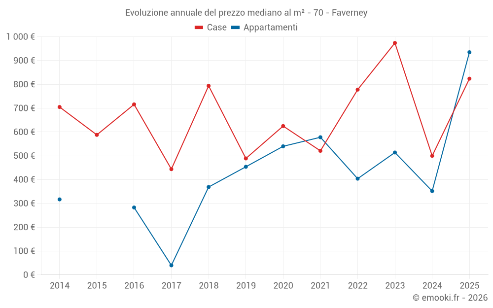 Il prezzo mediano sulle 23 transazioni di case degli ultimi 24 mesi nel comune di Faverney era di 864 € al metro quadrato per un valore patrimoniale mediano di 78 000 €. In questo periodo il 60% delle transazioni era tra 237 e 1 331 € al metro quadrato (dal 2° all'8° decile).