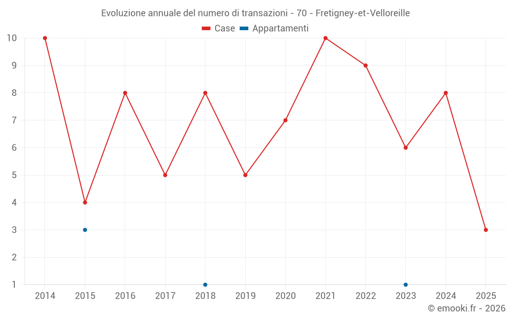 Il prezzo mediano sulle 16 transazioni di case degli ultimi 24 mesi nel comune di Fretigney-et-Velloreille era di 1 012 € al metro quadrato per un valore patrimoniale mediano di 138 400 €. In questo periodo il 60% delle transazioni era tra 741 e 1 781 € al metro quadrato (dal 2° all'8° decile).