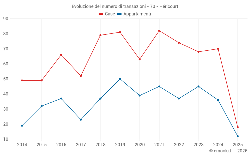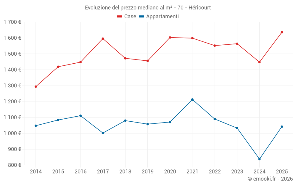 Il prezzo mediano sulle 18 transazioni di case degli ultimi 6 mesi nel comune di Héricourt era di 1 636 € al metro quadrato per un valore patrimoniale mediano di 128 000 €. In questo periodo il 60% delle transazioni era tra 1 279 e 2 180 € al metro quadrato (dal 2° all'8° decile).