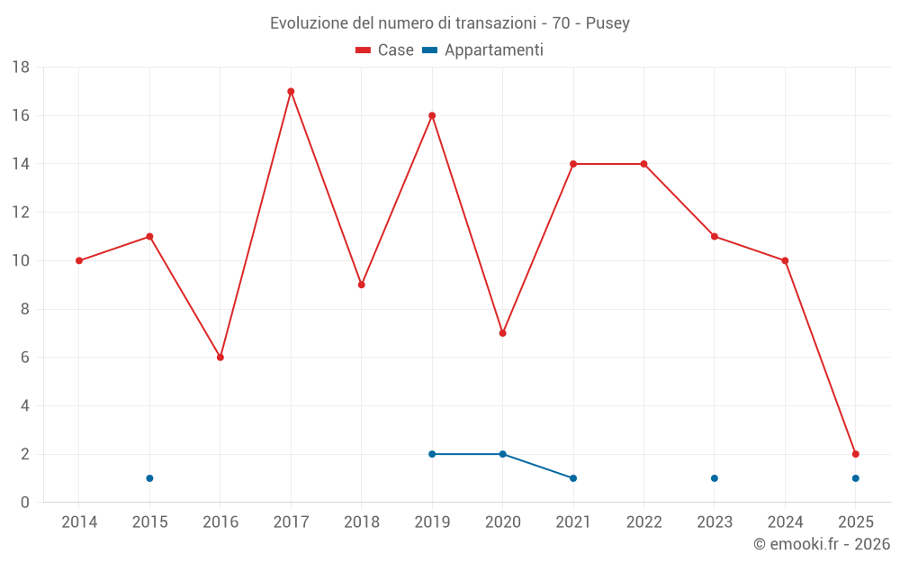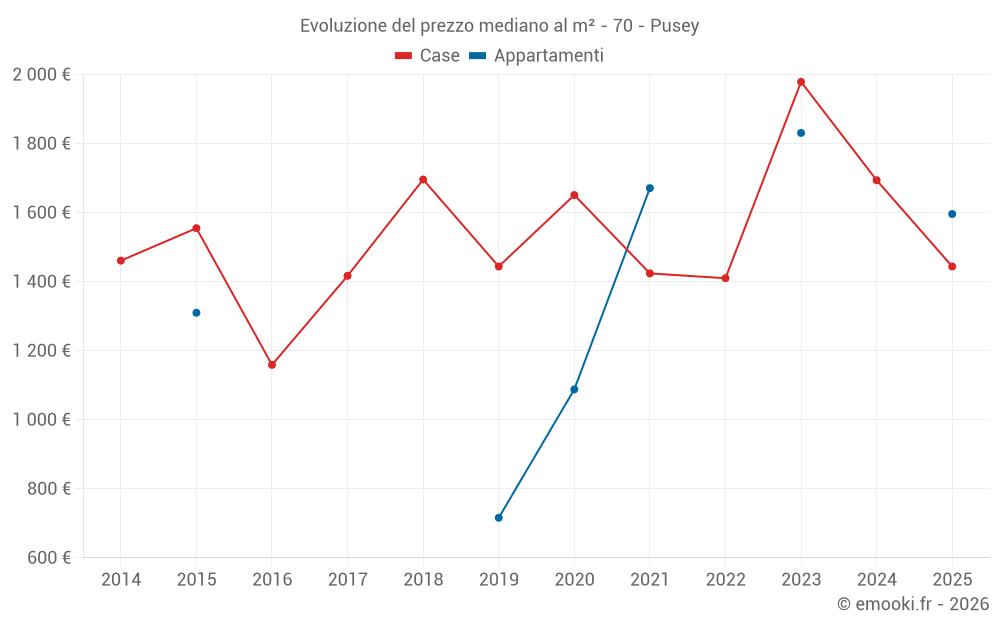 Il prezzo mediano sulle 20 transazioni di case degli ultimi 24 mesi nel comune di Pusey era di 1 701 € al metro quadrato per un valore patrimoniale mediano di 163 750 €. In questo periodo il 60% delle transazioni era tra 1 267 e 2 126 € al metro quadrato (dal 2° all'8° decile).