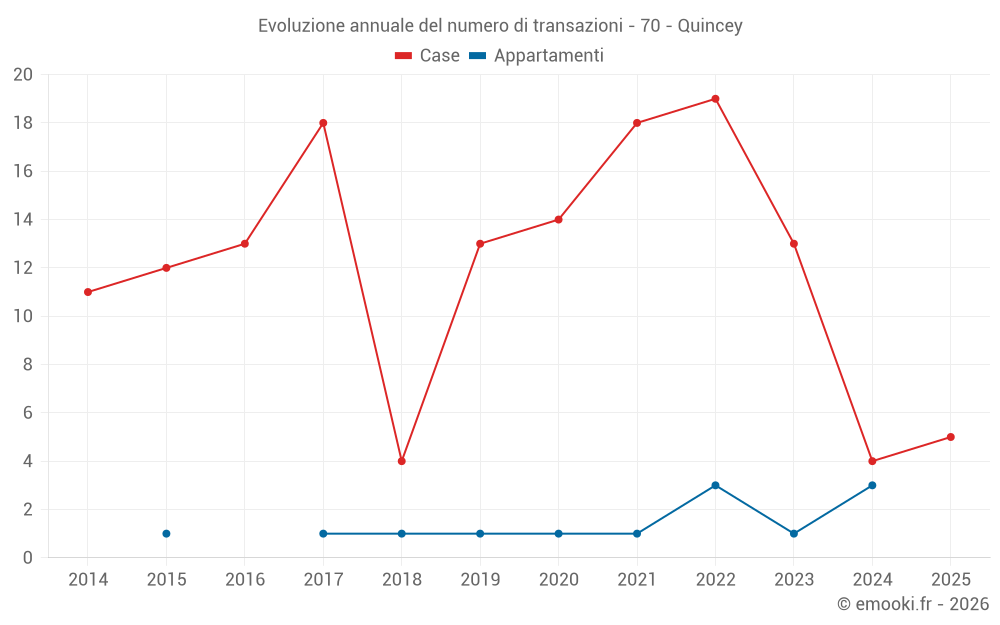 Il prezzo mediano sulle 15 transazioni di case degli ultimi 24 mesi nel comune di Quincey era di 1 608 € al metro quadrato per un valore patrimoniale mediano di 161 000 €. In questo periodo il 60% delle transazioni era tra 449 e 1 851 € al metro quadrato (dal 2° all'8° decile).