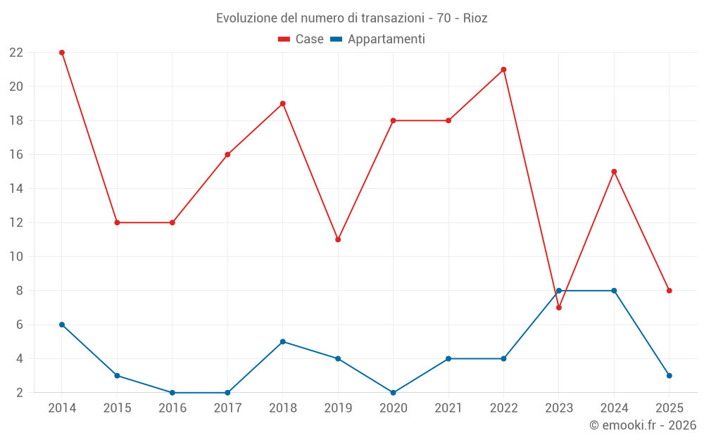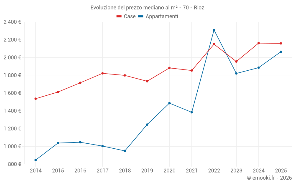 Il prezzo mediano sulle 25 transazioni di case degli ultimi 24 mesi nel comune di Rioz era di 2 162 € al metro quadrato per un valore patrimoniale mediano di 217 000 €. In questo periodo il 60% delle transazioni era tra 1 493 e 2 645 € al metro quadrato (dal 2° all'8° decile).
