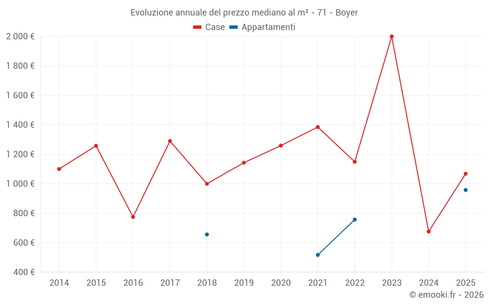 Il prezzo mediano sulle 14 transazioni di case degli ultimi 24 mesi nel comune di Boyer era di 1 257 € al metro quadrato per un valore patrimoniale mediano di 141 910 €. In questo periodo il 60% delle transazioni era tra 693 e 2 529 € al metro quadrato (dal 2° all'8° decile).