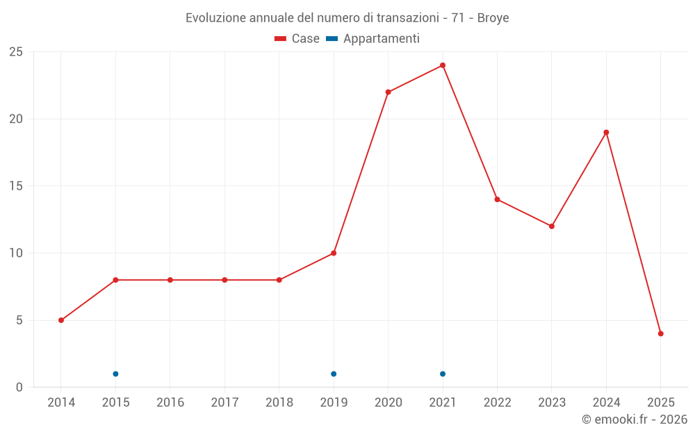 Il prezzo mediano sulle 32 transazioni di case degli ultimi 24 mesi nel comune di Broye era di 1 222 € al metro quadrato per un valore patrimoniale mediano di 120 000 €. In questo periodo il 60% delle transazioni era tra 728 e 1 536 € al metro quadrato (dal 2° all'8° decile).