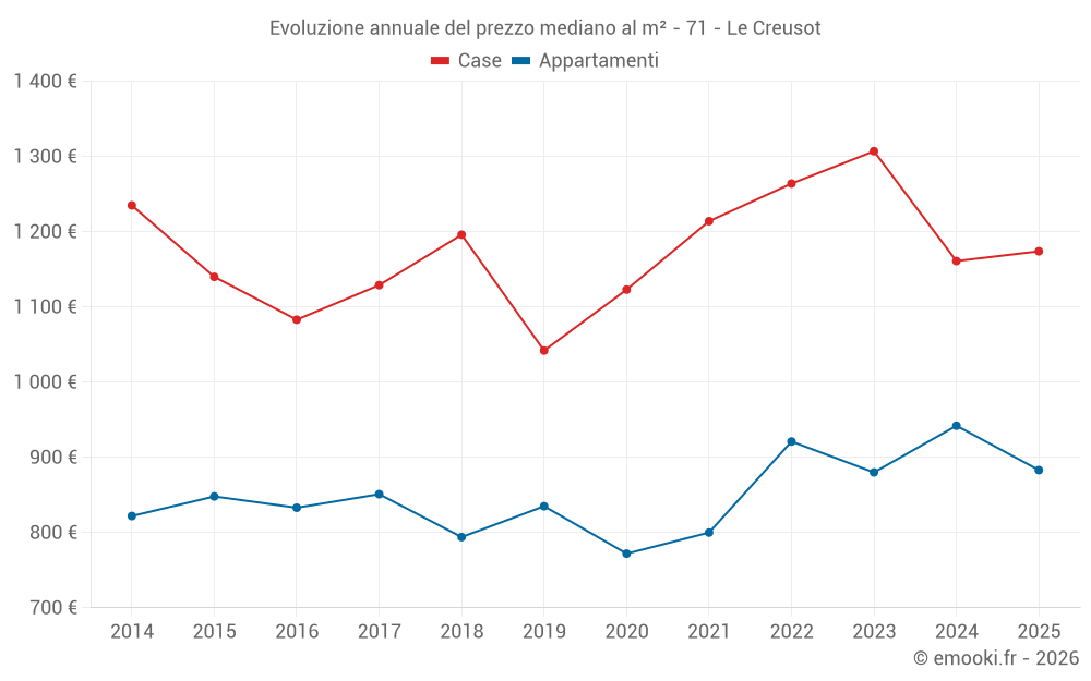 Il prezzo mediano sulle 24 transazioni di appartamenti degli ultimi 3 mesi nel comune di Le Creusot era di 874 € al metro quadrato per un valore patrimoniale mediano di 85 000 €. In questo periodo il 60% delle transazioni era tra 718 e 1 056 € al metro quadrato (dal 2° all'8° decile).