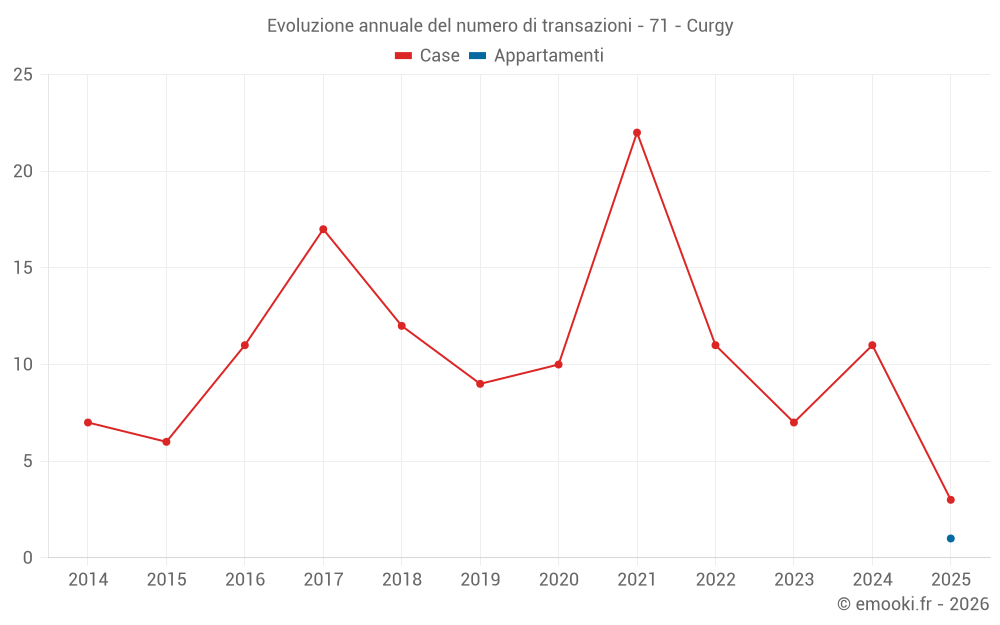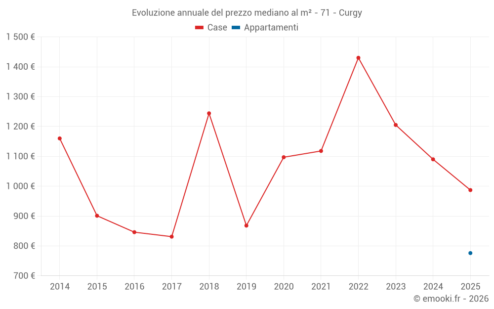 Il prezzo mediano sulle 19 transazioni di case degli ultimi 24 mesi nel comune di Curgy era di 1 144 € al metro quadrato per un valore patrimoniale mediano di 117 820 €. In questo periodo il 60% delle transazioni era tra 735 e 1 605 € al metro quadrato (dal 2° all'8° decile).