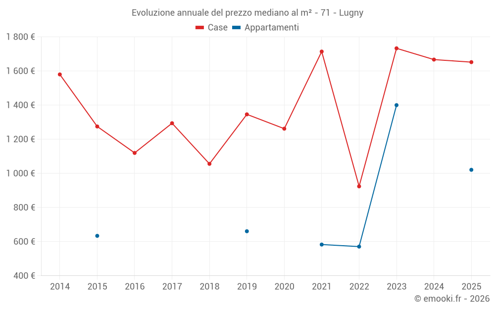 Il prezzo mediano sulle 20 transazioni di case degli ultimi 24 mesi nel comune di Lugny era di 1 667 € al metro quadrato per un valore patrimoniale mediano di 168 500 €. In questo periodo il 60% delle transazioni era tra 1 060 e 1 794 € al metro quadrato (dal 2° all'8° decile).