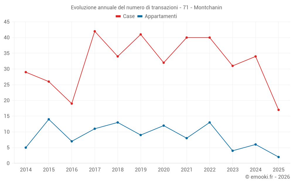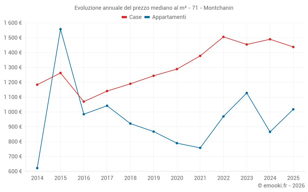 Il prezzo mediano sulle 32 transazioni di case degli ultimi 12 mesi nel comune di Montchanin era di 1 440 € al metro quadrato per un valore patrimoniale mediano di 118 500 €. In questo periodo il 60% delle transazioni era tra 816 e 1 754 € al metro quadrato (dal 2° all'8° decile).
