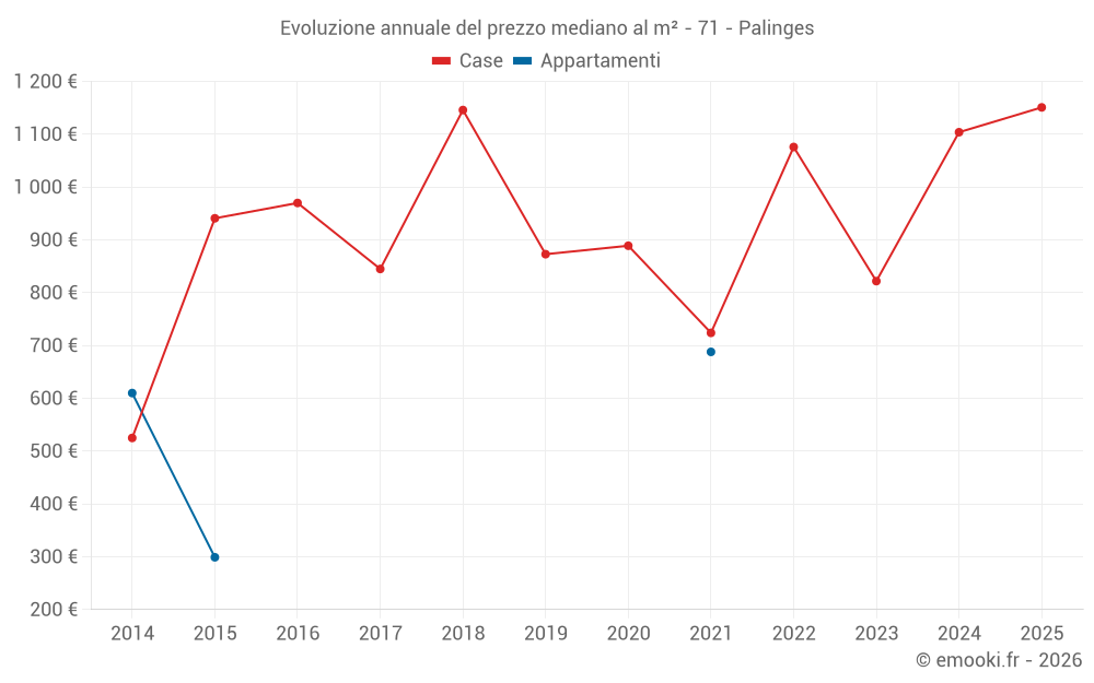 Il prezzo mediano sulle 42 transazioni di case degli ultimi 24 mesi nel comune di Palinges era di 1 078 € al metro quadrato per un valore patrimoniale mediano di 100 000 €. In questo periodo il 60% delle transazioni era tra 725 e 1 490 € al metro quadrato (dal 2° all'8° decile).