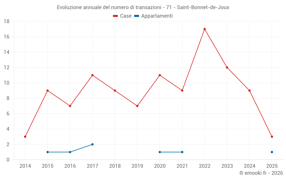 Il prezzo mediano sulle 19 transazioni di case degli ultimi 24 mesi nel comune di Saint-Bonnet-de-Joux era di 783 € al metro quadrato per un valore patrimoniale mediano di 81 000 €. In questo periodo il 60% delle transazioni era tra 463 e 1 849 € al metro quadrato (dal 2° all'8° decile).