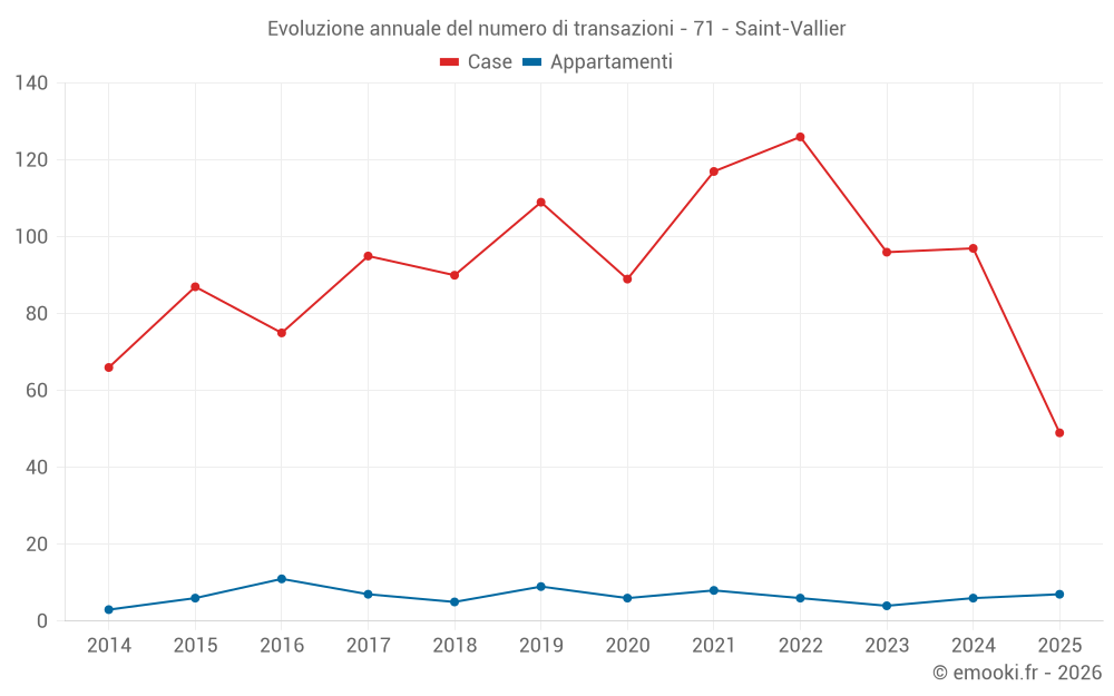 Il prezzo mediano sulle 30 transazioni di case degli ultimi 3 mesi nel comune di Saint-Vallier era di 1 218 € al metro quadrato per un valore patrimoniale mediano di 93 500 €. In questo periodo il 60% delle transazioni era tra 592 e 1 580 € al metro quadrato (dal 2° all'8° decile).