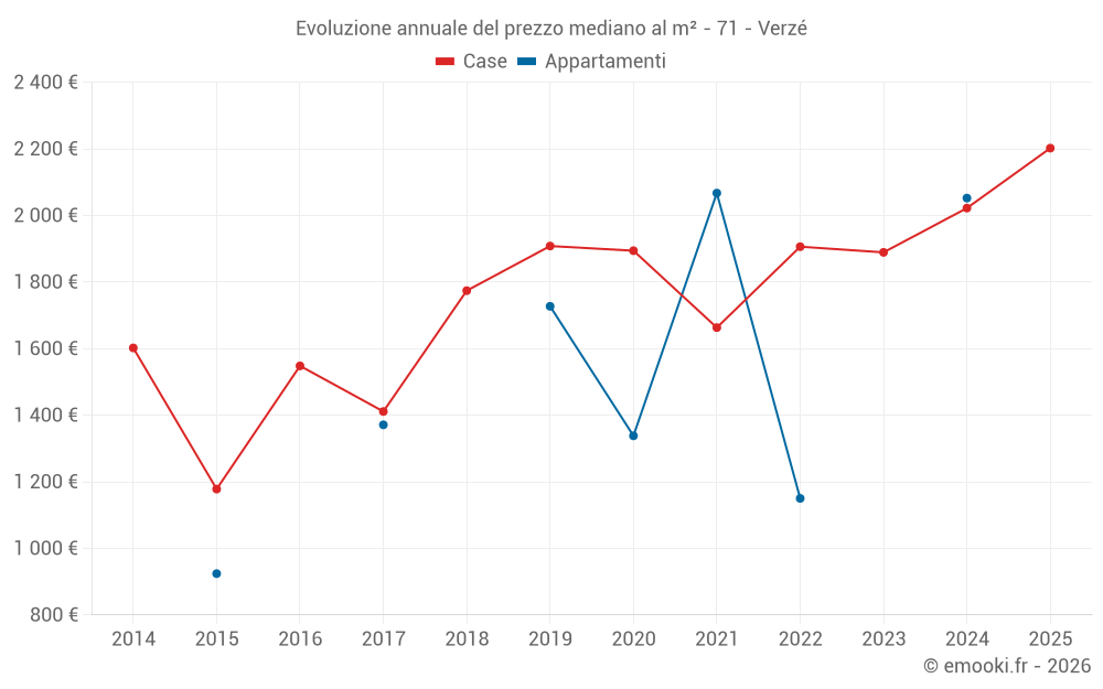 Il prezzo mediano sulle 14 transazioni di case degli ultimi 24 mesi nel comune di Verzé era di 1 990 € al metro quadrato per un valore patrimoniale mediano di 167 250 €. In questo periodo il 60% delle transazioni era tra 1 429 e 3 272 € al metro quadrato (dal 2° all'8° decile).