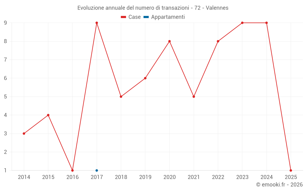 Il prezzo mediano sulle 16 transazioni di case degli ultimi 24 mesi nel comune di Valennes era di 1 268 € al metro quadrato per un valore patrimoniale mediano di 81 000 €. In questo periodo il 60% delle transazioni era tra 587 e 2 044 € al metro quadrato (dal 2° all'8° decile).