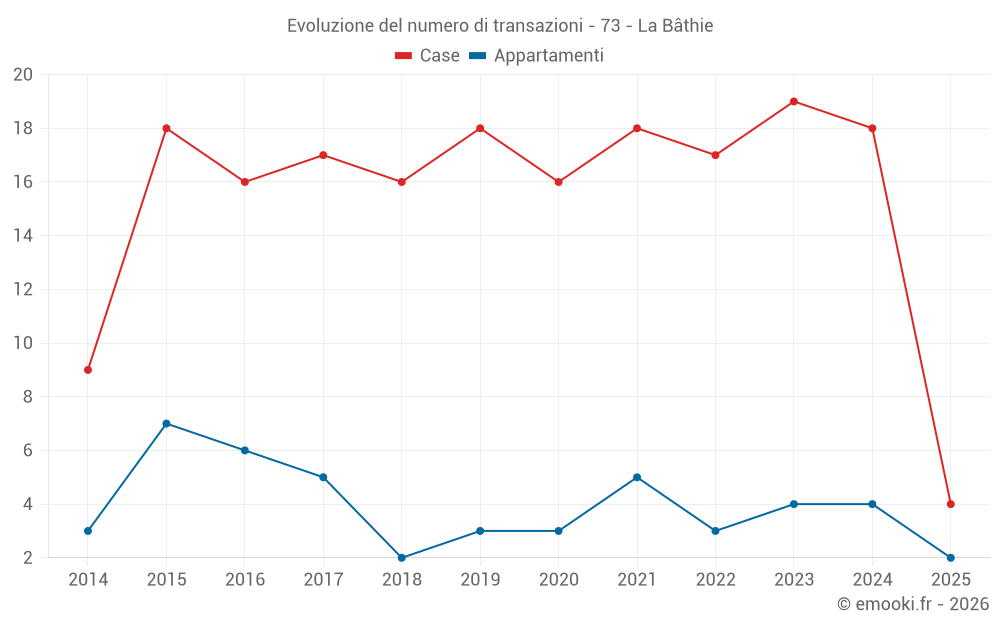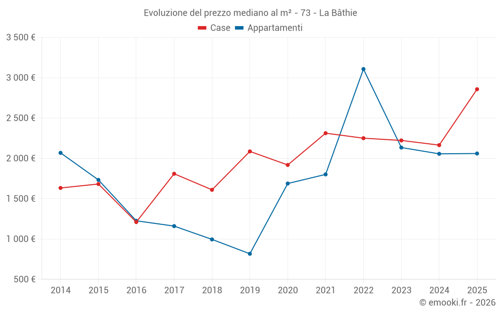 Il prezzo mediano sulle 17 transazioni di case degli ultimi 12 mesi nel comune di La Bâthie era di 2 611 € al metro quadrato per un valore patrimoniale mediano di 210 000 €. In questo periodo il 60% delle transazioni era tra 2 012 e 2 992 € al metro quadrato (dal 2° all'8° decile).