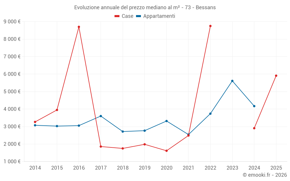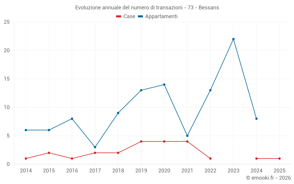 Il prezzo mediano sulle 29 transazioni di appartamenti degli ultimi 24 mesi nel comune di Bessans era di 5 322 € al metro quadrato per un valore patrimoniale mediano di 211 600 €. In questo periodo il 60% delle transazioni era tra 4 008 e 6 087 € al metro quadrato (dal 2° all'8° decile).