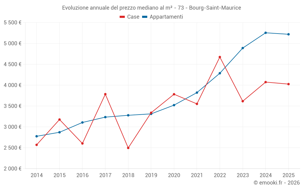 Il prezzo mediano sulle 17 transazioni di case degli ultimi 12 mesi nel comune di Bourg-Saint-Maurice era di 4 554 € al metro quadrato per un valore patrimoniale mediano di 770 000 €. In questo periodo il 60% delle transazioni era tra 2 656 e 7 766 € al metro quadrato (dal 2° all'8° decile).